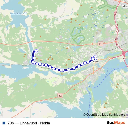 The first stop of the 79b bus route is Nokia A and the last stop is Linnavuoren koulu. 79b (Linnavuori - Nokia) is operational during everyday.