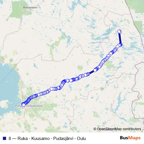 The first stop of the 8 bus route is Ruka Kumpare and the last stop is Oulu Linja-autoasema, tulolaituri. 8 (Ruka - Kuusamo - Pudasjärvi - Oulu) is operational during everyday.