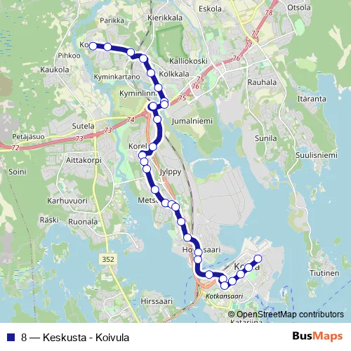 See why over 2 million users trust and consider busmaps.com as the best public transport website. busmaps gives you Kotka Buses suggested routes, real-time bus tracker, line route maps in Kotka, and helps to find the closest 8 bus stops near you. No internet available? Download an offline PDF map and bus schedule for the 8 bus to take on your trip.