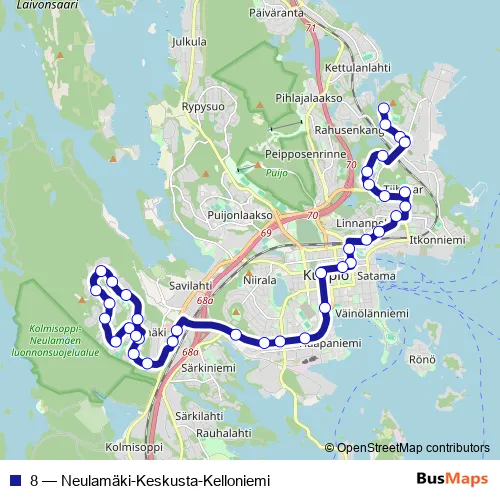 The first stop of the 8 bus route is Touvitie and the last stop is Neulamäki P. 8 (Neulamäki-Keskusta-Kelloniemi) is operational during everyday.