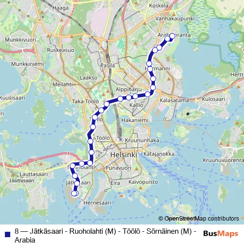 See why over 2 million users trust and consider busmaps.com as the best public transport website. busmaps gives you Helsinki Trams suggested routes, real-time bus tracker, line route maps in Helsinki, and helps to find the closest 8 tram stops near you. No internet available? Download an offline PDF map and bus schedule for the 8 tram to take on your trip.