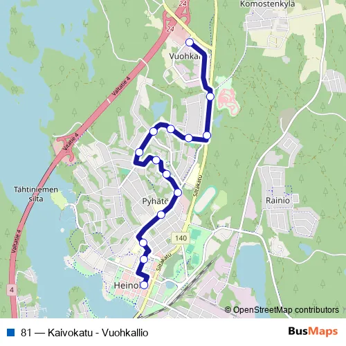 See why over 2 million users trust and consider busmaps.com as the best public transport website. busmaps gives you Heinola Buses suggested routes, real-time bus tracker, line route maps in Heinola, and helps to find the closest 81 bus stops near you. No internet available? Download an offline PDF map and bus schedule for the 81 bus to take on your trip.