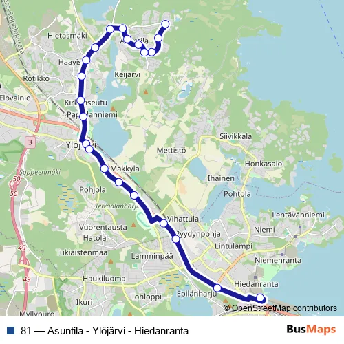 The first stop of the 81 bus route is Asuntila and the last stop is Hiedanranta D. 81 (Asuntila - Ylöjärvi - Hiedanranta) is operational during everyday.