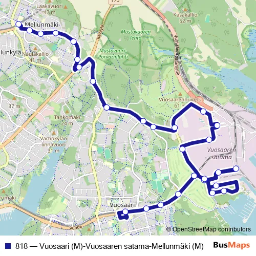 The first stop of the 818 bus route is Mellunmäki (M) and the last stop is Vuosaari(M), tulo. 818 (Vuosaari (M)-Vuosaaren satama-Mellunmäki (M)) is operational during on weekdays.