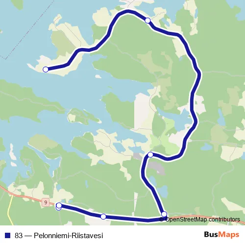 The first stop of the 83 bus route is Vehkalampi, koulu and the last stop is Pelonniemi. 83 (Pelonniemi-Riistavesi) is operational during on weekdays.