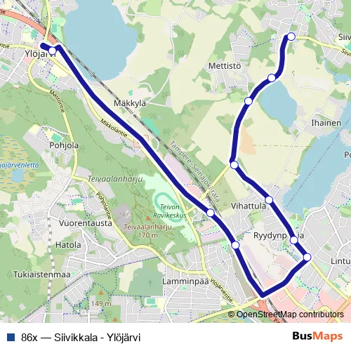 The first stop of the 86x bus route is Siivikkalantie and the last stop is Ylöjärvi C. 86x (Siivikkala - Ylöjärvi) is operational during on weekdays.