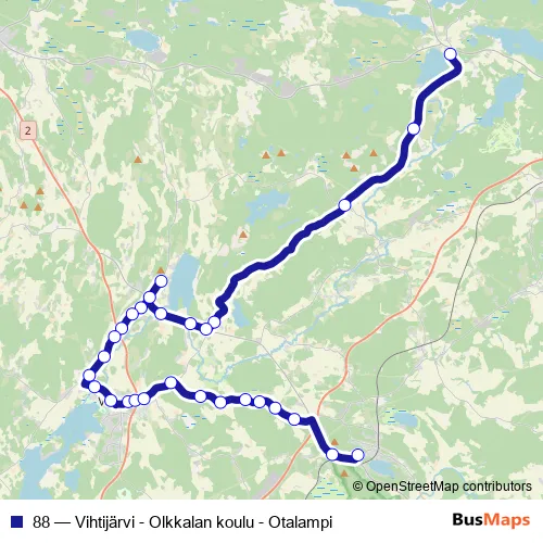 The first stop of the 88 bus route is Vihtijärvi E and the last stop is Otalampi koulukeskus P. 88 (Vihtijärvi - Olkkalan koulu - Otalampi) is operational during on weekdays.