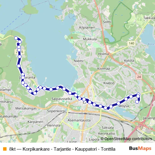 The first stop of the 8kt bus route is Korpikankare and the last stop is Riihitarhankatu. 8kt (Korpikankare - Tarjantie - Kauppatori - Tonttila) is operational during everyday.