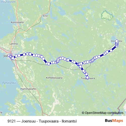 The first stop of the 9121 bus route is Joensuu and the last stop is Ilomantsi linja-autoasema. 9121 (Joensuu - Tuupovaara - Ilomantsi) is operational during everyday.
