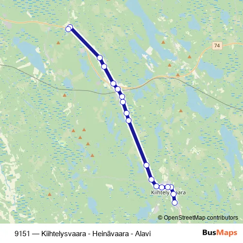 The first stop of the 9151 bus route is Kiihtelysvaara koulu, P and the last stop is Alavi, L. 9151 (Kiihtelysvaara - Heinävaara - Alavi) is operational during on weekdays.