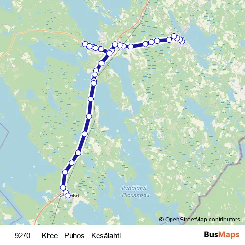 The first stop of the 9270 bus route is Kitee linja-autoasema and the last stop is Kesälahden tori (Kitee). 9270 (Kitee - Puhos - Kesälahti) is operational during on weekdays.