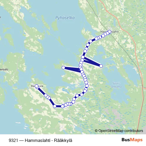 The first stop of the 9321 bus route is Hammaslahti linja-autoasema and the last stop is Rääkkylä keskusta. 9321 (Hammaslahti - Rääkkylä) is operational during on weekdays.