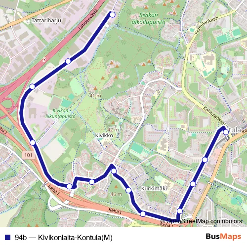 The first stop of the 94b bus route is Kivikonlaita 43 and the last stop is Kontula (M). 94b (Kivikonlaita-Kontula(M)) is operational during on weekdays.