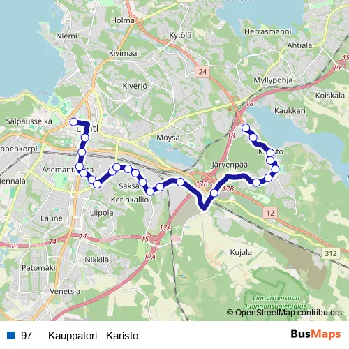 See why over 2 million users trust and consider busmaps.com as the best public transport website. busmaps gives you Lahti Buses suggested routes, real-time bus tracker, line route maps in Lahti, and helps to find the closest 97 bus stops near you. No internet available? Download an offline PDF map and bus schedule for the 97 bus to take on your trip.