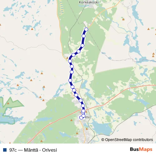 The first stop of the 97c bus route is Orivesi and the last stop is Lepo P. 97c (Mänttä - Orivesi) is operational during on weekdays.