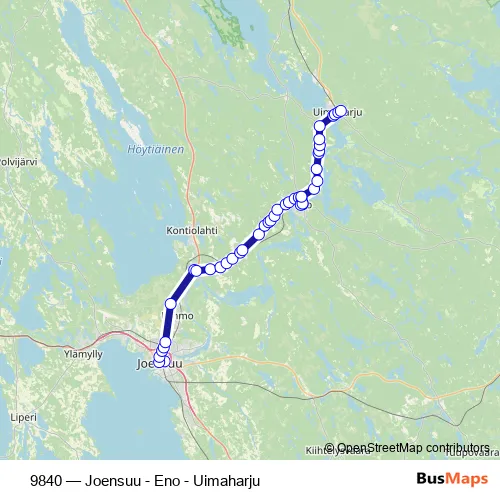 The first stop of the 9840 bus route is Joensuu and the last stop is Uimaharju, Asemankaari 5. 9840 (Joensuu - Eno - Uimaharju) is operational during on weekdays.