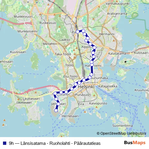 See why over 2 million users trust and consider busmaps.com as the best public transport website. busmaps gives you Helsinki Trams suggested routes, real-time bus tracker, line route maps in Helsinki, and helps to find the closest 9h tram stops near you. No internet available? Download an offline PDF map and bus schedule for the 9h tram to take on your trip.