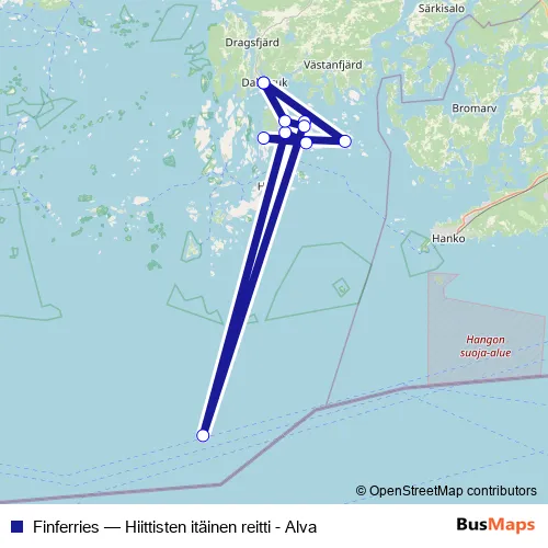 The first stop of the Finferries ferry route is Dalsbruk and the last stop is Dalsbruk. Finferries (Hiittisten itäinen reitti - Alva) is operational during on weekdays.
