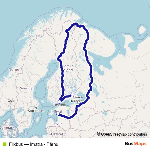 The first stop of the Flixbus bus route is Parnu Bus Station and the last stop is Imatra Keskusliikenneasema. Flixbus (Imatra - Pärnu) is operational during on weekends.