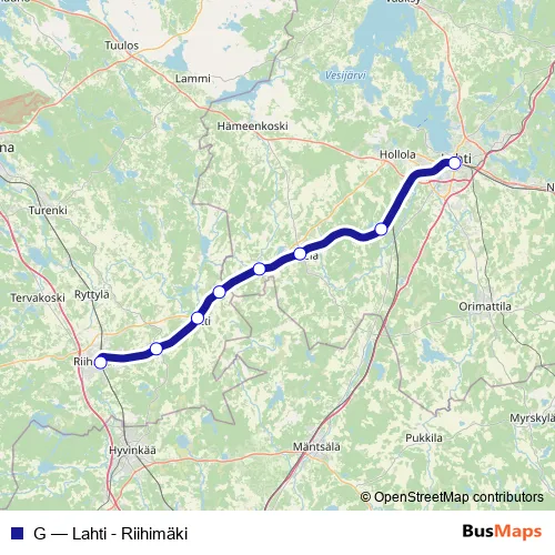 The first stop of the G rail route is Riihimäki and the last stop is Lahti. G (Lahti - Riihimäki) is operational during everyday.