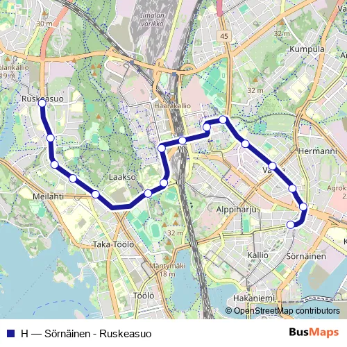 The first stop of the H tram route is Ruskeasuo and the last stop is Sörnäinen (M). H (Sörnäinen - Ruskeasuo) is operational during everyday.