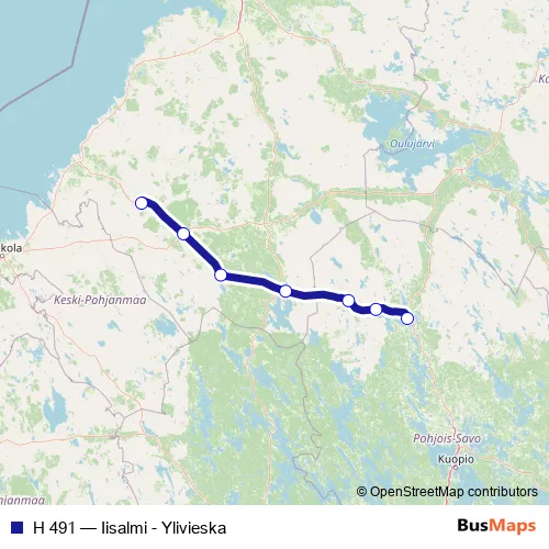 The first stop of the H 491 rail route is Iisalmi and the last stop is Ylivieska. H 491 (Iisalmi - Ylivieska) is operational during everyday.