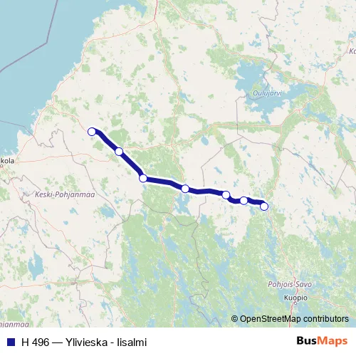 The first stop of the H 496 rail route is Ylivieska and the last stop is Iisalmi. H 496 (Ylivieska - Iisalmi) is operational during everyday.