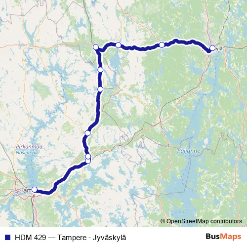 The first stop of the HDM 429 rail route is Tampere and the last stop is Jyväskylä. HDM 429 (Tampere - Jyväskylä) is operational during everyday.