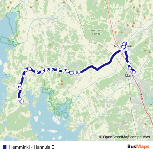 The first stop of the Hemminki - Hannula E bus route is Hemminki and the last stop is