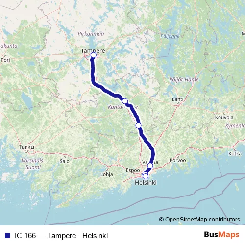 The first stop of the IC 166 rail route is Tampere and the last stop is Helsinki. IC 166 (Tampere - Helsinki) is operational during on weekdays.