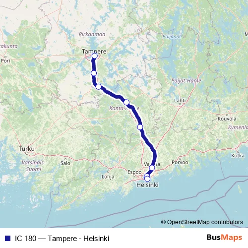 The first stop of the IC 180 rail route is Tampere and the last stop is Helsinki. IC 180 (Tampere - Helsinki) is operational during everyday.