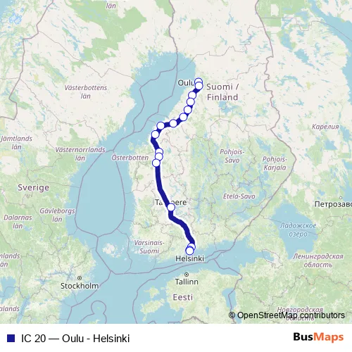 The first stop of the IC 20 rail route is Oulu and the last stop is Helsinki. IC 20 (Oulu - Helsinki) is operational during everyday.