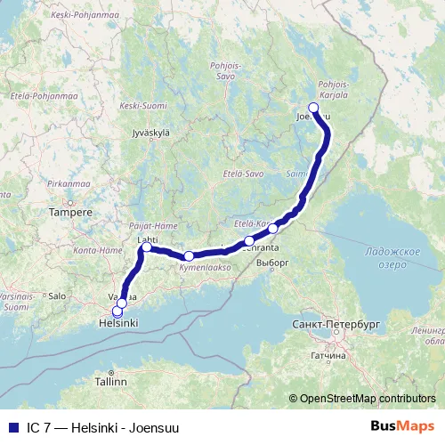 The first stop of the IC 7 rail route is Helsinki and the last stop is Joensuu. IC 7 (Helsinki - Joensuu) is operational during everyday.