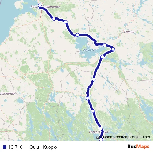 The first stop of the IC 710 rail route is Oulu and the last stop is Kuopio. IC 710 (Oulu - Kuopio) is operational during everyday.