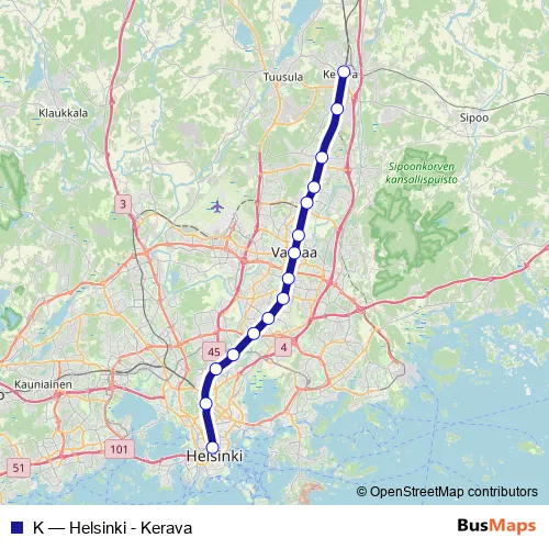 See why over 2 million users trust and consider busmaps.com as the best public transport website. busmaps gives you Helsinki Rail Services suggested routes, real-time bus tracker, line route maps in Helsinki, and helps to find the closest K rail stops near you. No internet available? Download an offline PDF map and bus schedule for the K rail to take on your trip.