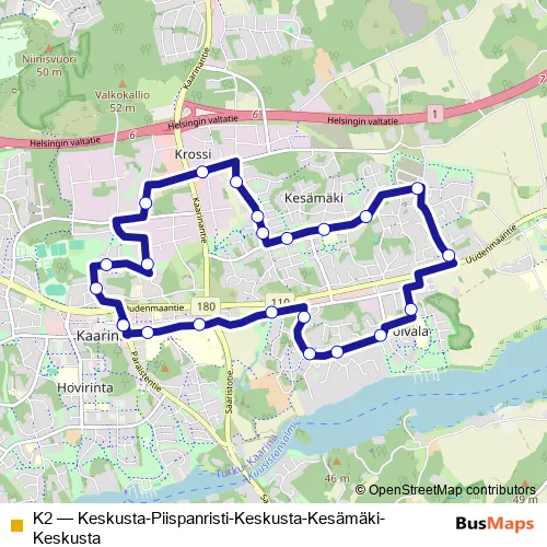 The first stop of the K2 bus route is Kaarina and the last stop is Kaarina. K2 (Keskusta-Piispanristi-Keskusta-Kesämäki-Keskusta) is operational during everyday.