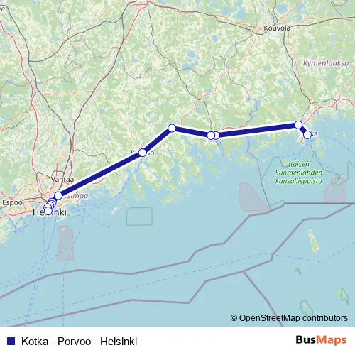 See why over 2 million users trust and consider busmaps.com as the best public transport website. busmaps gives you Helsinki Buses suggested routes, real-time bus tracker, line route maps in Helsinki, and helps to find the closest Kotka - Porvoo - Helsinki bus stops near you. No internet available? Download an offline PDF map and bus schedule for the Kotka - Porvoo - Helsinki bus to take on your trip.