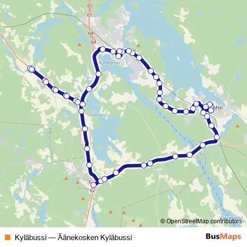 The first stop of the Kyläbussi bus route is Suolahti and the last stop is Suolahti. Kyläbussi (Äänekosken Kyläbussi) is operational during on weekdays.