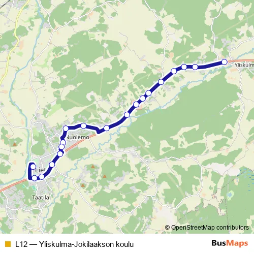 The first stop of the L12 bus route is Yliskulma and the last stop is Jokilaakson koulun takapiha. L12 (Yliskulma-Jokilaakson koulu) is operational during on weekdays.