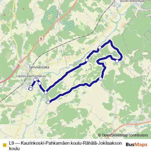 The first stop of the L9 bus route is Kaurinkoskentie and the last stop is Pahkamäen koulu. L9 (Kaurinkoski-Pahkamäen koulu-Rähälä-Jokilaakson koulu) is operational during on weekdays.