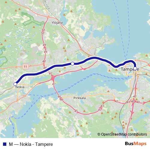 The first stop of the M rail route is Nokia and the last stop is Tampere. M (Nokia - Tampere) is operational during everyday.