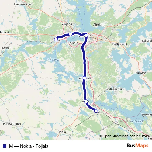 The first stop of the M rail route is Nokia and the last stop is Toijala. M (Nokia - Toijala) is operational during everyday.