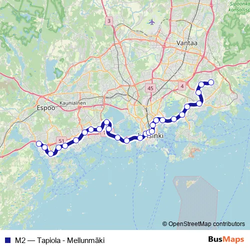 See why over 2 million users trust and consider busmaps.com as the best public transport website. busmaps gives you Helsinki Metro Lines suggested routes, real-time bus tracker, line route maps in Helsinki, and helps to find the closest M2 metro stops near you. No internet available? Download an offline PDF map and bus schedule for the M2 metro to take on your trip.