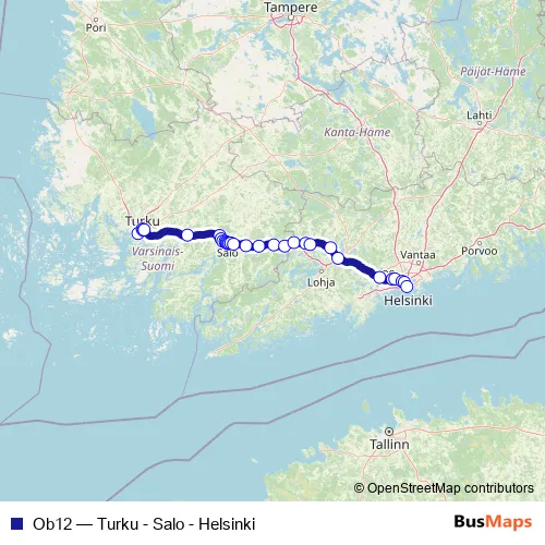 The first stop of the Ob12 bus route is 1 and the last stop is 30-35. Ob12 (Turku - Salo - Helsinki) is operational during everyday.
