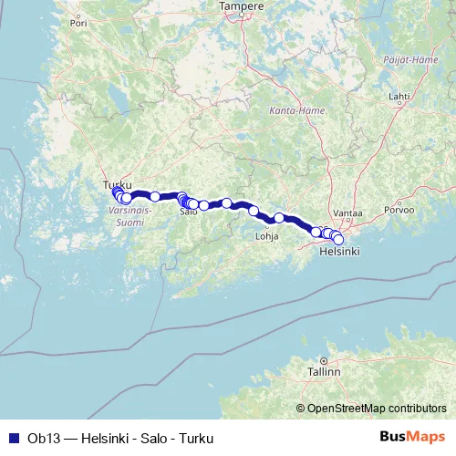 The first stop of the Ob13 bus route is 1 and the last stop is 30-35. Ob13 (Helsinki - Salo - Turku) is operational during everyday.