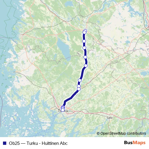 The first stop of the Ob25 bus route is Huittinen ABC piha and the last stop is Linja-autoasema, tulolaituri. Ob25 (Turku - Huittinen Abc) is operational during on weekends.