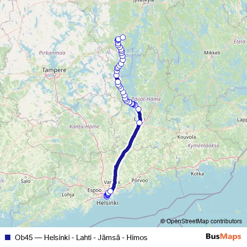 Services on the Ob45 - Helsinki - Lahti - Jämsä - Himos bus stop at 19:55 on Monday, Thursday, Friday, Saturday, Sunday.