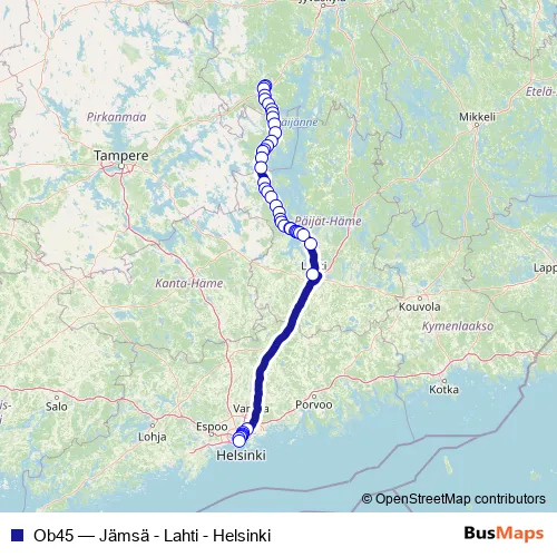 The first stop of the Ob45 bus route is Tulo and the last stop is 30-35. Ob45 (Jämsä - Lahti - Helsinki) is operational during everyday.