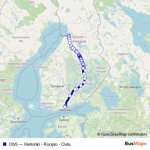 The first stop of the Ob5 bus route is 12 and the last stop is 30-35. Ob5 (Helsinki - Kuopio - Oulu) is operational during everyday.