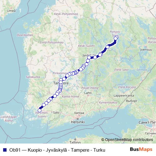 The first stop of the Ob91 bus route is Linja-autoasema 8 and the last stop is Linja-autoasema, tulolaituri. Ob91 (Kuopio - Jyväskylä - Tampere - Turku) is operational during on weekends.